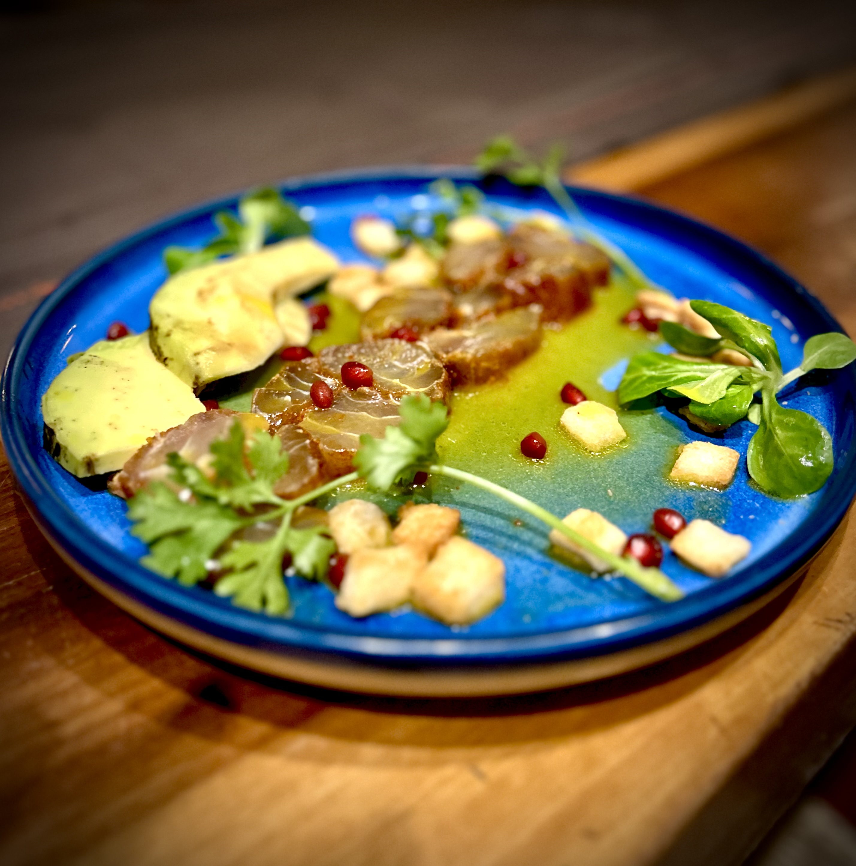 Elenco degli allergeniLe Gravlax de Loubine et son parfum d'agrumes. Accompagné de sa vinaigrette fruit de la passion, coriandre & croûtons